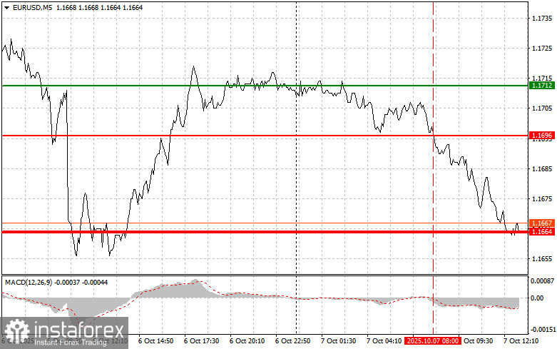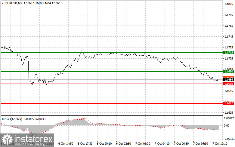 Scenario #2: I also plan to buy the euro if there are two consecutive tests of the 1.1658 level at the moment when the MACD indicator is in the oversold zone. This would limit the pair's downward potential and lead to a reversal upward. Growth toward the opposite levels of 1.1680 and 1.1715 may then be expected.