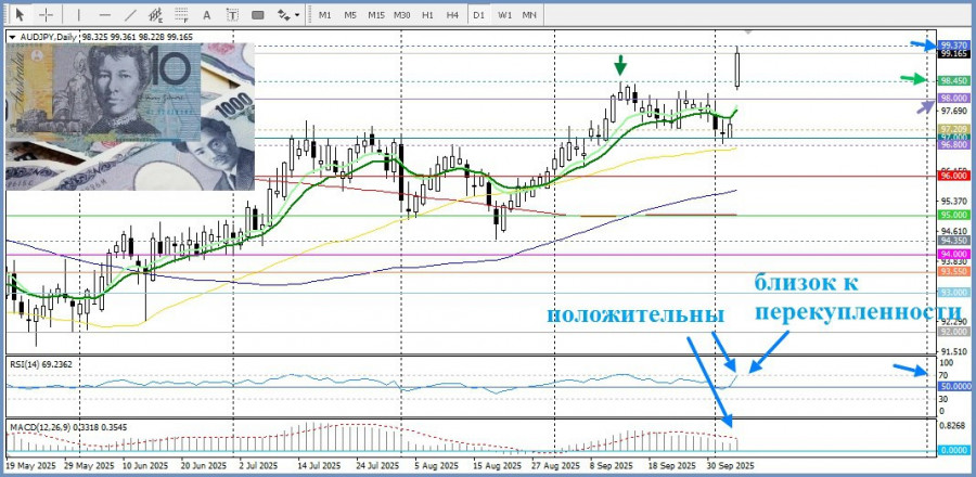 В субботу во втором туре выборов лидером Либерально-демократической партии (ЛДП) стала Санаэ Такаити, которую собираются утвердить в качестве первой женщины-премьера Японии на парламентской сессии в середине октября. Такаити считается «фискальным голубем» и может объявить более экспансионистскую экономическую политику. Это увеличивает шансы на то, что Банк Японии в этом месяце не повысит ставки, что вызывает агрессивные продажи иены и способствует сильному росту пары AUD/JPY.