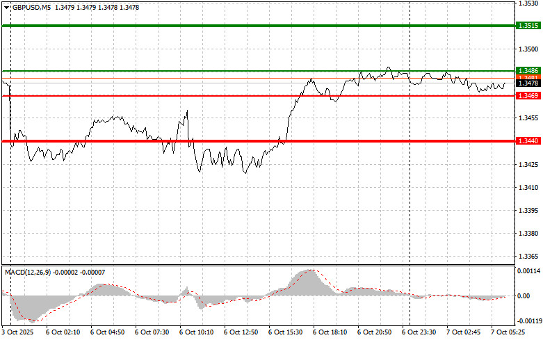 Сценарий №2: покупать фунт сегодня также планирую в случае двух подряд тестов цены 1.3469 в момент, когда индикатор MACD будет находиться в области перепроданности. Это ограничит нисходящий потенциал пары и приведет к обратному развороту рынка вверх. Можно ожидать рост к противоположным уровням 1.3486 и 1.3515.