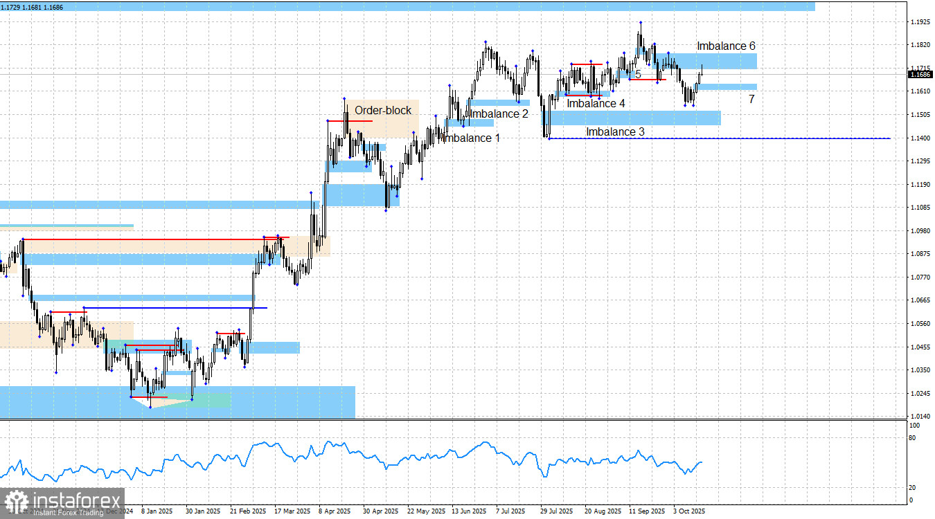 От имбалансов 1, 2, 4 и 5 трейдеры имели возможность покупать евровалюту. Во всех случаях мы увидели определенный рост. Возможность открывать новые покупки по тренду появятся лишь в «бычьем» имбалансе 3 или же «бычьем» имбалансе 7. Цена имеет возможность в ближайшее время отработать один из этих паттернов, поэтому уже на следующей неделе у трейдеров может появиться возможность открывать новые покупки с целью 1,1976.