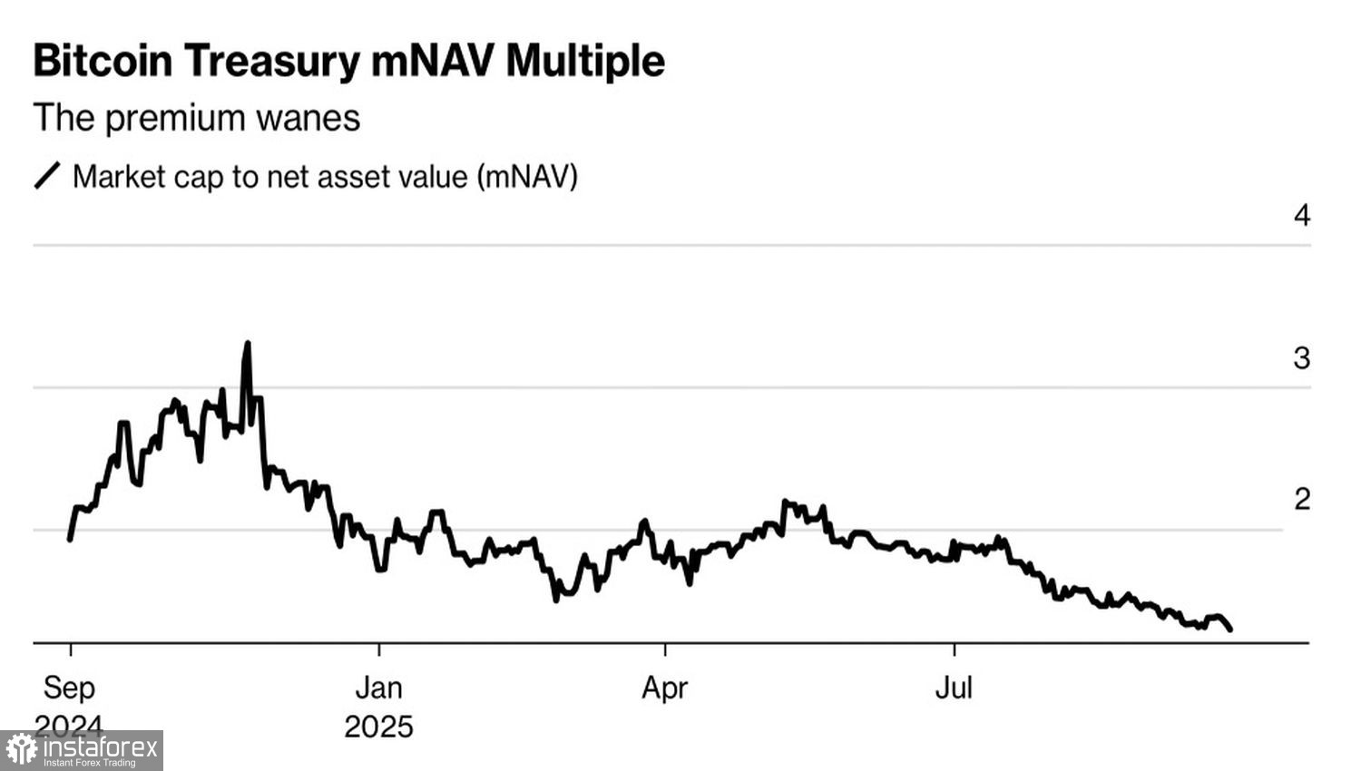 Падение котировок акций криптоказначейств привело к снижению их кратной рыночной капитализации почти до нулевых отметок. Показатель измеряет, насколько цена долевых бумаг компании находится выше стоимости ее резервов в цифровых активах.
