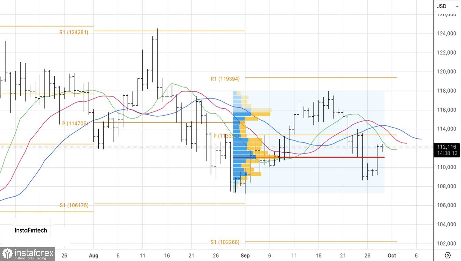 Технически на дневном графике BTC/USD «быки» пытаются отыграть разворотный паттерн Двойное основание. Необходимыми условиями являются успешный штурм поддержек в виде пивот-уровня на 113400 и скользящих средних вблизи отметки 114700. Только в этом случае можно будет возвращаться к покупкам. Пока следует сохранять акцент на короткие позиции.
