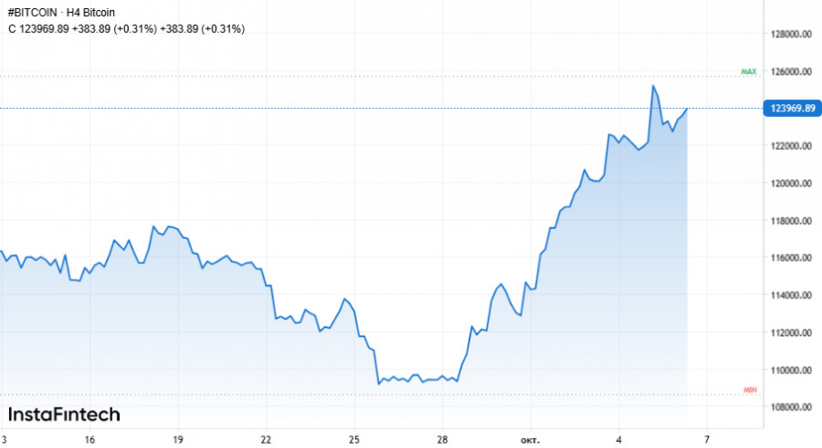 На этом фоне золото уверенно превысило $3 900 за унцию, но главная звезда уикенда – именно биткоин. Криптовалюта выросла более чем на 30% с начала года, оставив позади прежний максимум $124 514 от 14 августа. И, как ни странно, этому способствует не только шатдаун, но и общее оживление американского фондового рынка, где акции бьют рекорды на волне сделок в сфере искусственного интеллекта.