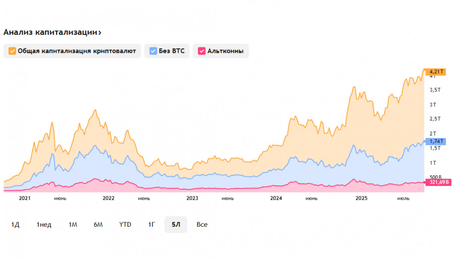 Несмотря на то что за последние сутки общая капитализация крипторынка упала на 0,12%, к 4,214 трлн, на текущий момент (по данным TradingView) на фоне коррекции с недавних рекордных максимумов, с начала месяца она выросла на 8,2% с 3,9 трлн.