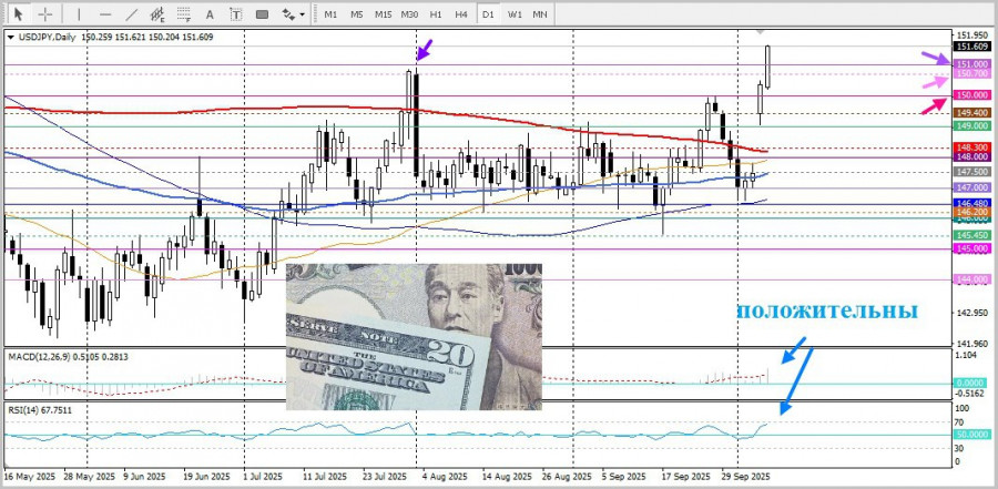 А с технической точки зрения, вчерашний прорыв психологического уровня 150,00 благоприятствует быкам. Более того, осцилляторы на дневном графике остаются на положительной территории, указывая на то, что путь наименьшего сопротивления для спотовых цен восходящий. Тем более, что цены уже пробили максимум августа в районе 151,00.