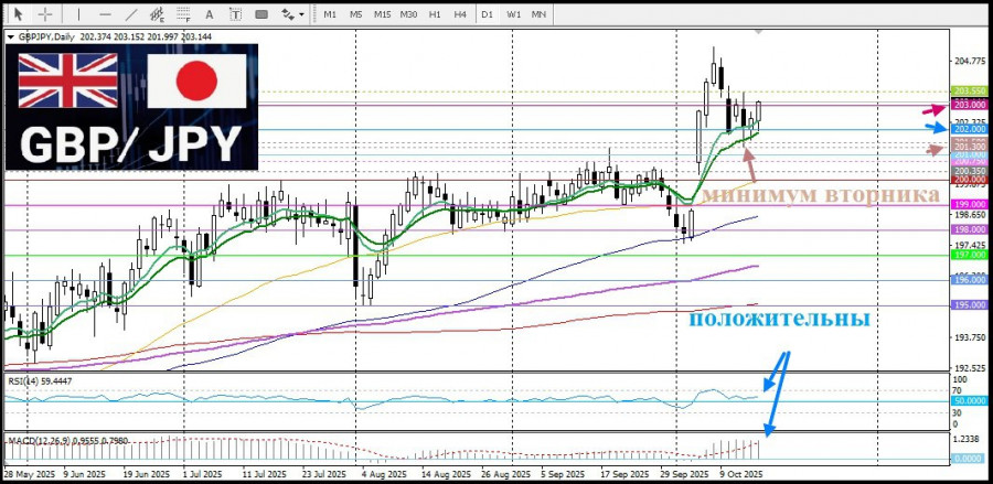 А с технической точки зрения осцилляторы на дневном графике положительны, поэтому путь наименьшего сопротивления для пары восходящий. Тем не менее прежде чем открывать новые позиции на покупку, стоит дождаться устойчивого движения выше круглого уровня 203,00.