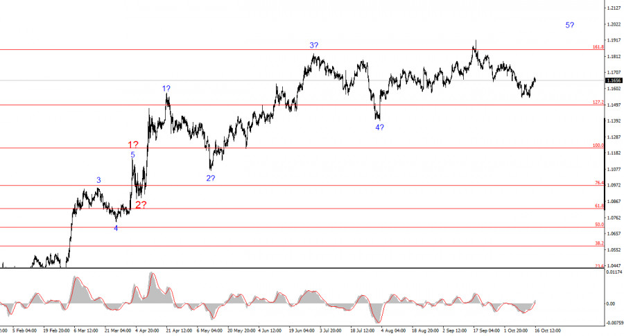 Построение повышательного участка тренда продолжается, а новостной фон продолжает поддерживать по большей части не доллар. Торговая война, начатая Дональдом Трампом, продолжается. Противостояние с ФРС продолжается. «Голубиные» ожидания рынка по ставке ФРС растут. В Америке продолжается «шатдаун». Рынок крайне невысоко оценивает результаты первых 7-8 месяцев Дональда Трампа, хоть экономический рост во втором квартале и составил почти 4%.