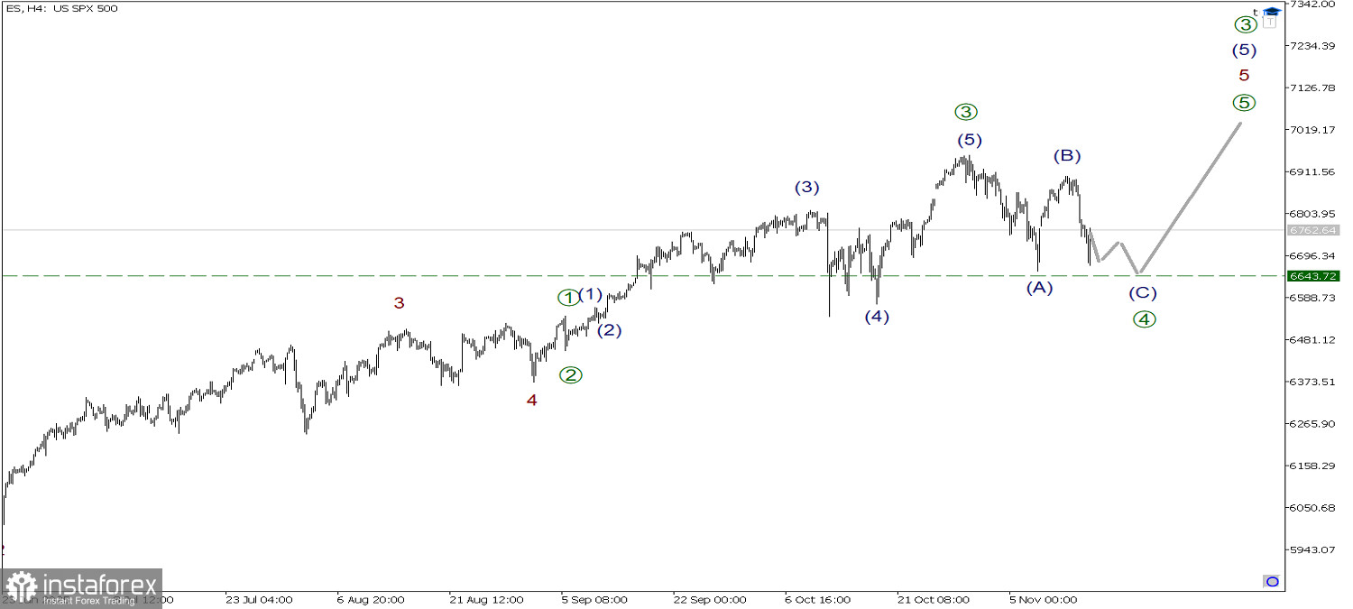 В текущей ситуации можно рассматривать открытие длинных позиций с целью забрать прибыль на завершении импульсного роста в районе предыдущего максимума 6995.37.