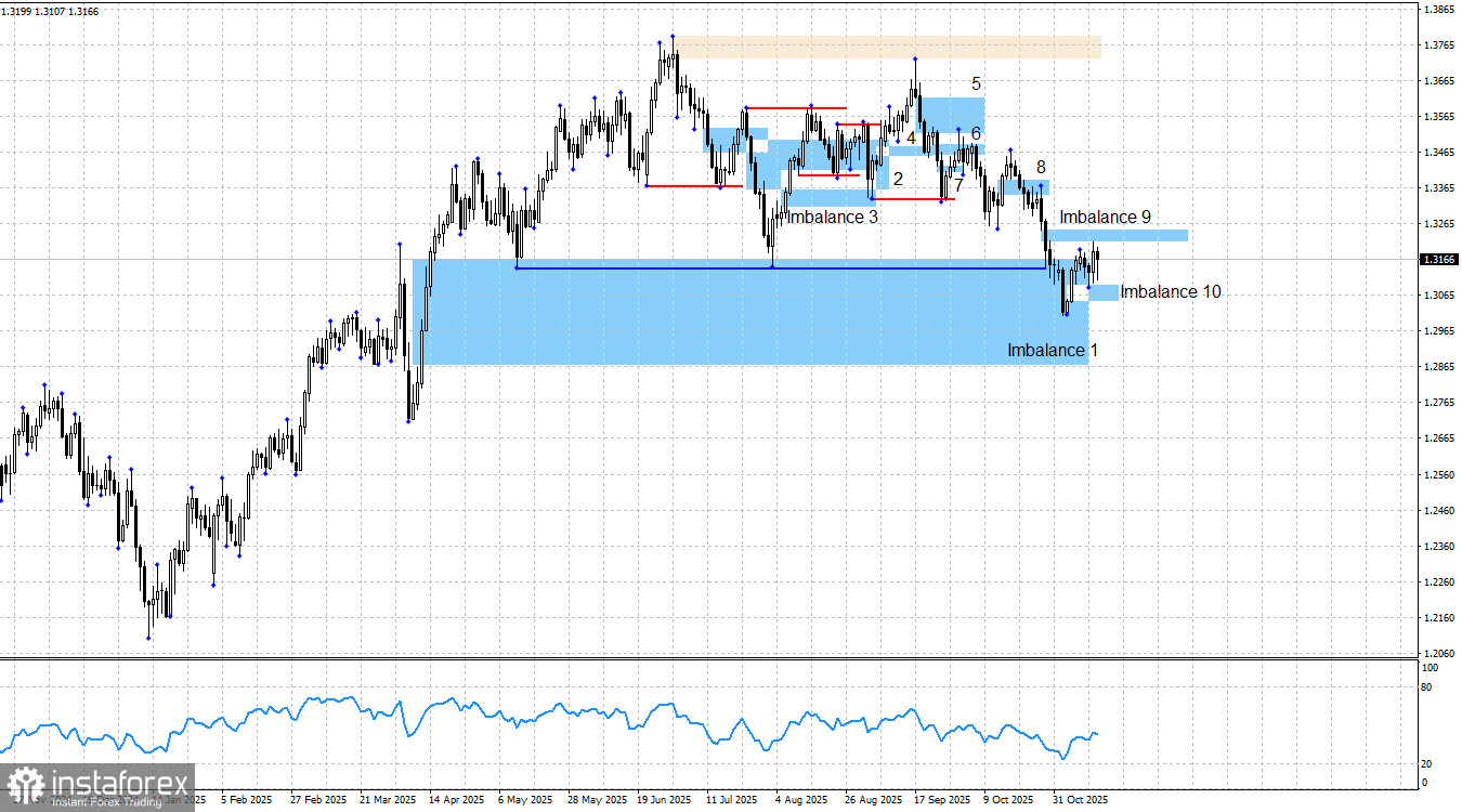 Для «медвежьего» тренда нужен сильный и стабильный для американца позитивный информационный фон, которого нет и не было. Чем ниже проседает курс британской валюты, тем выгоднее быкам открывать новые сделки на покупку. Последнее наступление медведей началось после реакции на «медвежий» ордер-блок, а затем было поддержано тремя имбалансами. Остается и четвертый «медвежий» имбаланс (9), который может создать проблемы «бычьему» тренду, на восстановление которого я все еще рассчитываю.
