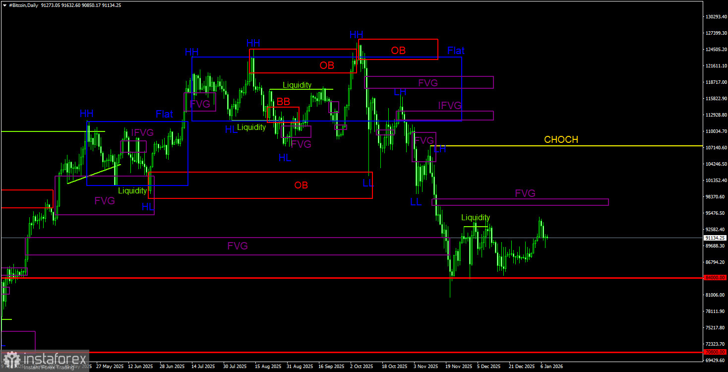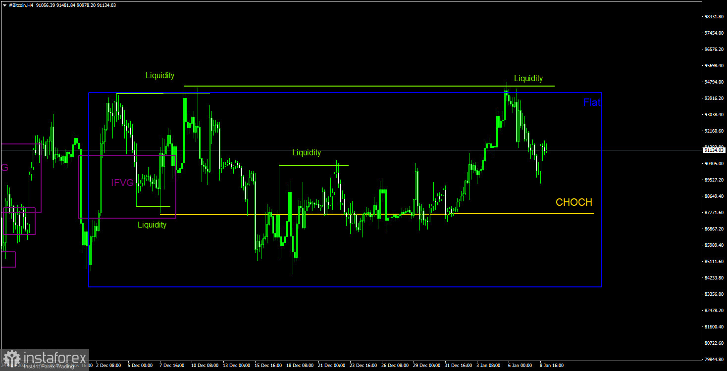 Биткоин продолжает четко следовать технической картине. Мы говорили о том, что ожидать формирования сигналов внутри бокового канала можно только около его границ. Около верхней и нижней линий флэта можно ожидать только девиации и снятия ликвидности. Именно девиацию со снятием ликвидности мы и увидели в 5 января. Таким образом, трейдеры имели отличный сигнал на продажу, который в данное время продолжает отрабатываться. Многие эксперты положительно оценили начало года для криптовалютного рынка, считая, что биткоин демонстрирует намерения расти весь 2026 год. На наш взгляд, это абсолютно не так. На 4-часовом ТФ отлично виден флэт, а флэт – это всегда рэндом. Грубо говоря, нет никакой зависимости между ростом в начале года и возможным ростом в течение года. Биткоин просто торгуется внутри ограниченного ценового диапазона, внутри которого возможен, как рост, так и падение.