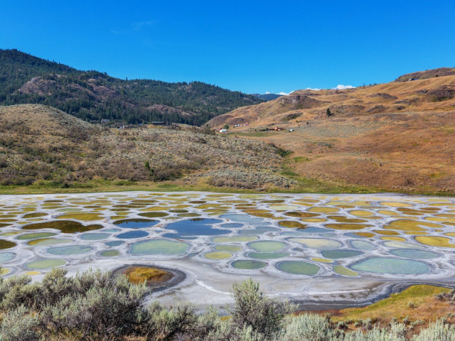Пятнистое озеро – удивительный природный феномен, расположенный в Британской Колумбии. Его поверхность летом покрывается множеством круглых пятен желтого, зеленого и голубого оттенков. Такой рисунок создается благодаря высокой концентрации минералов: магния, кальция и сульфатов. Когда вода частично испаряется, на дне остаются разноцветные круги, и озеро превращается в живую палитру, напоминающую мозаичное полотно.